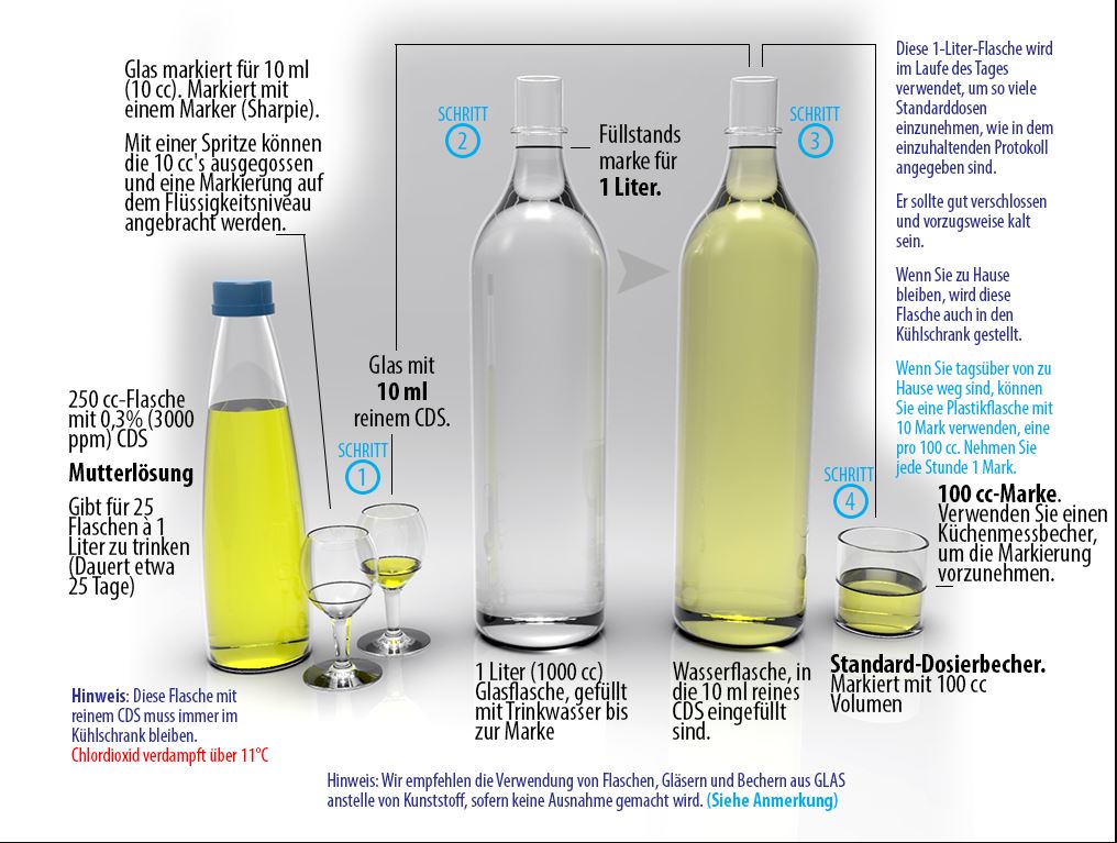 Vorbereitung: Täglich zwei Flaschen mit 0.8 bzw. 1 Liter Wasser füllen und darin 8 bzw. 10 ml CDL auflösen. Daraus jeweils ein Glas mit 1 dl abfüllen und einnehmen. Am besten bringt man am Glas die 1 dl-Markierung an.
