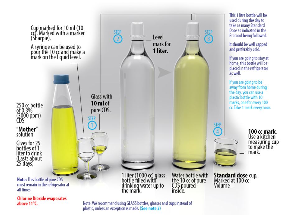 Achtung: es handelt sich um eine konzentrierte Anwendung für die Bekämpfung  eines gefährlichen Virus! Die nachstehenden Angaben beziehen sich auf die fertige Chlordioxid-Lösung CDL bzw. CDS (und nicht auf MMS).